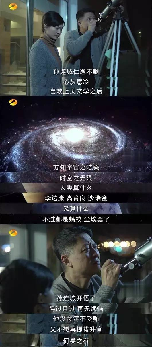 与易学习一样仕途不顺的孙连城,失意中迷上了“看星星”:宇宙浩渺、时空无限,上级李达康、高育良、沙瑞金算什么,人类又算什么,不过都是蚂蚁尘埃罢了。我孙连城,还胸怀宇宙呢。升不升官,都无所谓了,不干事,不惹事,就等着正点下课了。