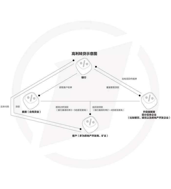 陈大海说,金融掮客们有一条隐蔽而有效的项目筛选路径:通过银行内部“资源”,掌握一批即将到期的优质银行贷款客户——按照常规,这批客户在银行借款到期时要么按时还款,要么还旧借新,往往以后者居多——银行方面的“资源”会将部分“优质”客户名单交给金融掮客,掮客们会组织资金为这些客户解燃眉之急:对需要还旧借新的客户,掮客们会提供过桥资金,按银行基准利率3-5倍甚至更高的比例收息;被银行突然停贷的客户,可以从这些掮客处获得后续的资金,需要支付的利息一般是银行基准利率的2-4倍,也有更高的。这些金融掮客实际上大多自己就是出借主体,银行内部“资源”自然也是他们的利益共同体。这是一条极为灰色的链条。