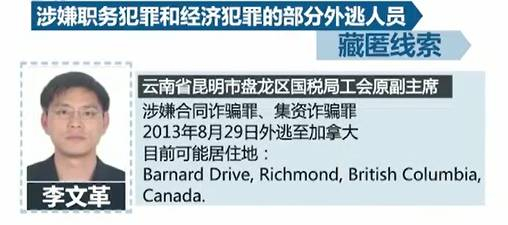 李文革,云南省昆明市盘龙区国税局工会原副主席,涉嫌合同诈骗罪、集资诈骗罪。2013年8月29日外逃至加拿大。