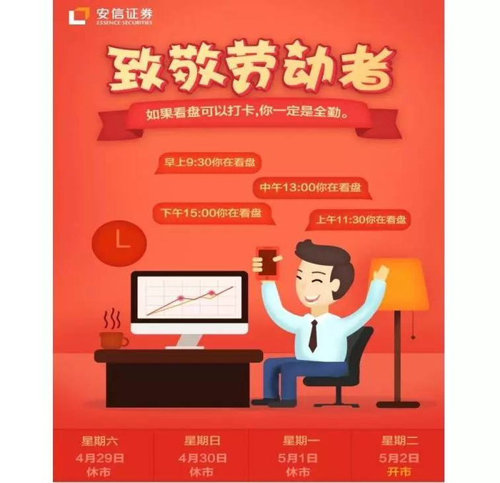 亦是提醒休市时间的安信证券,有点儿意思,“致敬劳动者:早上9:30,你在看盘,中午13:00你在看盘,下午15:00你在看盘,上午11:30你在看盘。如果看盘可以打卡,你一定是全勤。”