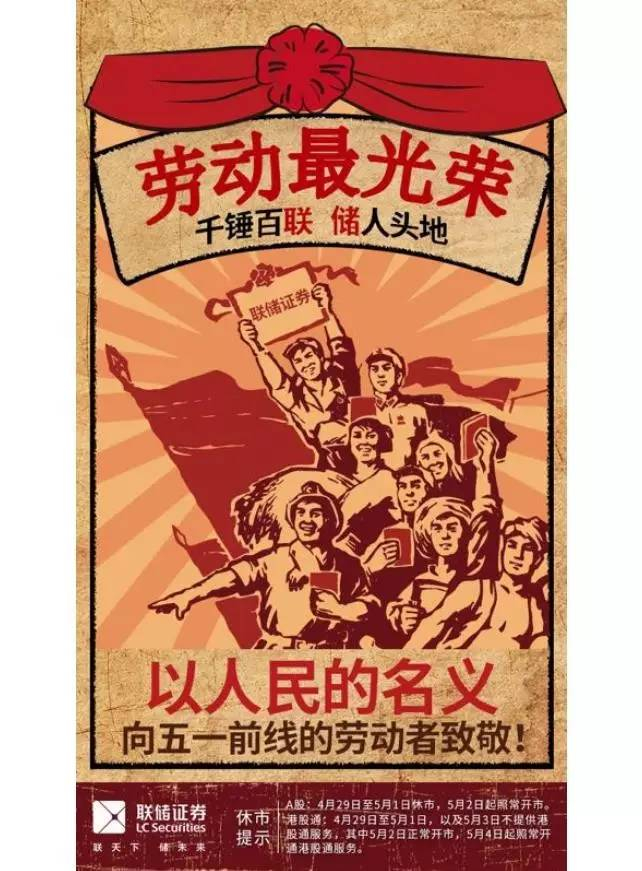 联储证券这张海报有些酷炫!复古怀旧style不说,这“人民的名义”,使用得恰到好处!此外,提出“劳动最光荣”的文艺联储证券,还把自家公司的名称,与五一劳动节来了次结合。“千锤百联,储人头地”,把谐音用到极致,也足以看出这家券商为了这张海报,开了多少脑洞!