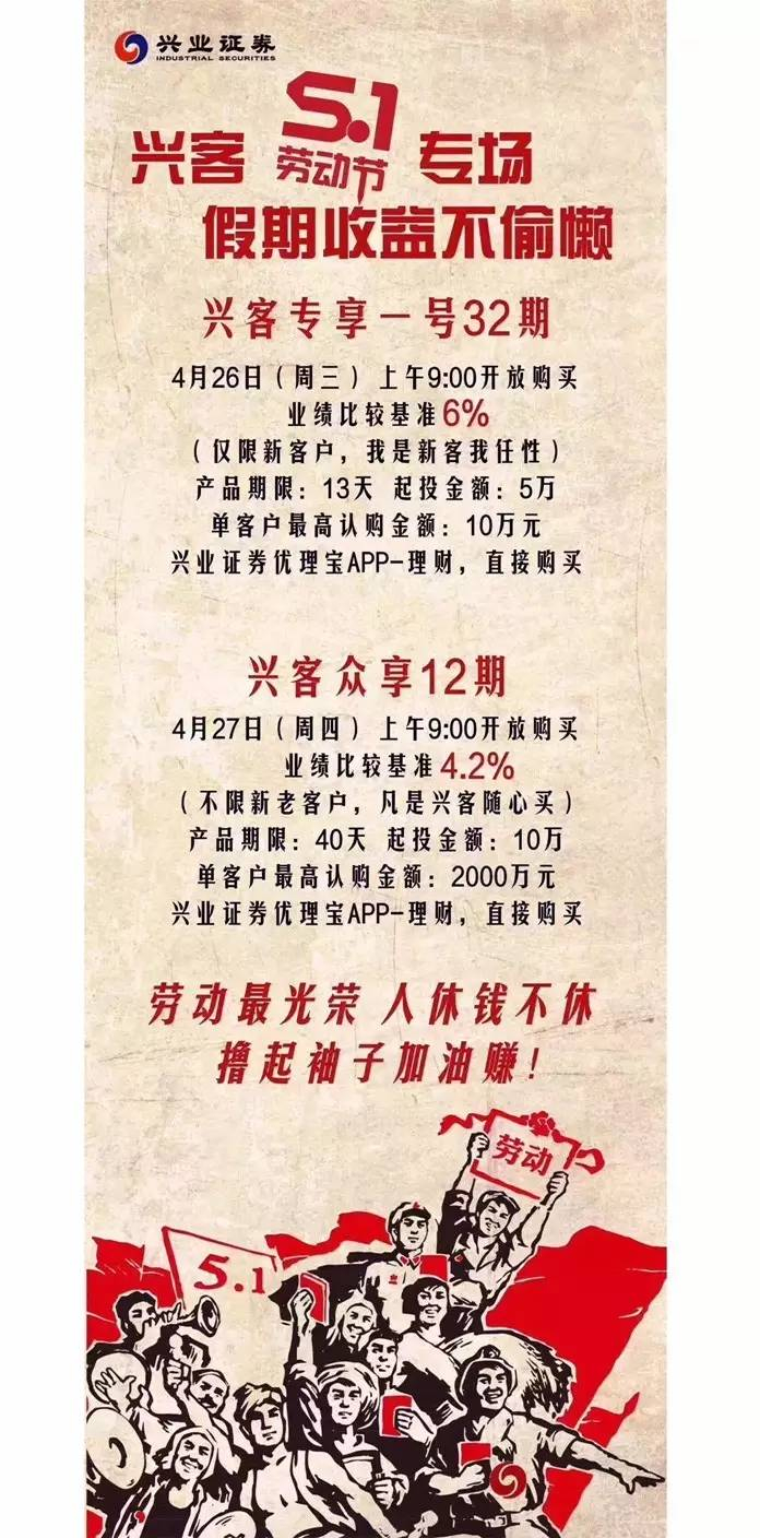 兴业证券也不示弱,来场“兴客劳动节专场”!这家券商专门为了劳动节推出了两款理财产品,分别是兴客专享一号32期、兴客众享12期,前者仅限新客户,后者新老客户共享。两款劳动节主题理财产品的目标是,“人闲钱不闲,撸起袖子加油赚”!