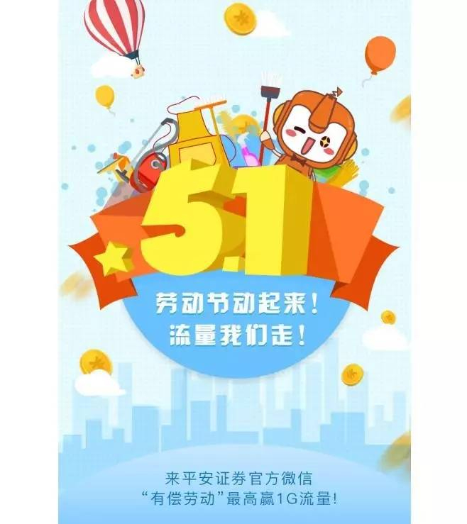 此外,平安证券也送来实惠。“劳动节动起来,流量我们走”。平安证券送的优惠是,只要关注平安证券官方微信,“有偿劳动”最高赢1G的手机流量。