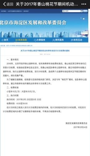 记者注意到,按次收费不违规,海淀区发改委对此发过说明文件,称今年“桃花节”期间,为缓解拥堵,香山附近占道停车场实行计次收费。