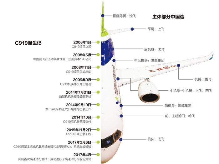 从设计研发到总装下线,进而实现首飞,中国商飞公司用了9年,这架大飞机也串起了国内外一条完整的飞机制造产业链——200多家企业、36所高校、数十万产业人员参与研发,70家企业成为C919的供应商或潜在供应商,其中包括中航工业、宝钢等国字头的央企,有专注于装备制造的民企,还有美国通用电气公司(GE)、霍尼韦尔(Honeywell)等国际巨头的身影。其中,C919的主体部分多为中国造,而发动机和航电系统则融入了外资技术。