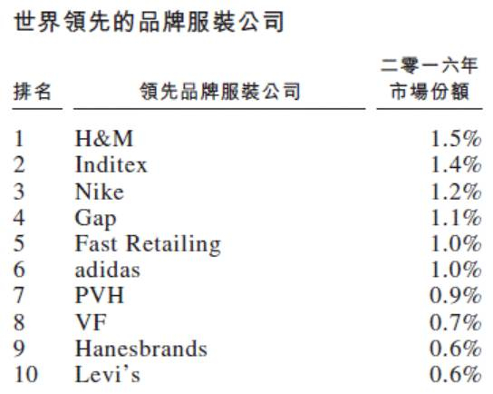 前十名全球领先服装品牌有7家是其客户