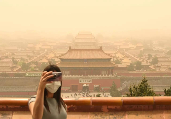 △2017年5月4日,北京气象台发布沙尘暴蓝色预警,市区能见度明显下降,城市空间灰蒙一片。(图自:视觉中国)