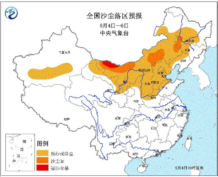 4日傍晚,中央气象台继续发布沙尘暴蓝色预警:预计4日夜间至5日,北方大部将先后出现4-6级风,阵风8-9级,其中,内蒙古中东部、华北北部、东北地区西部等地局地阵风风力可达10级。北京等地区的扬沙或浮尘天气也将继续,其中内蒙古中东部部分地区有沙尘暴。
