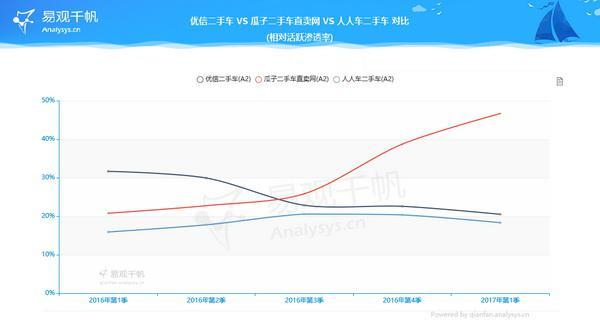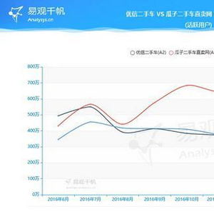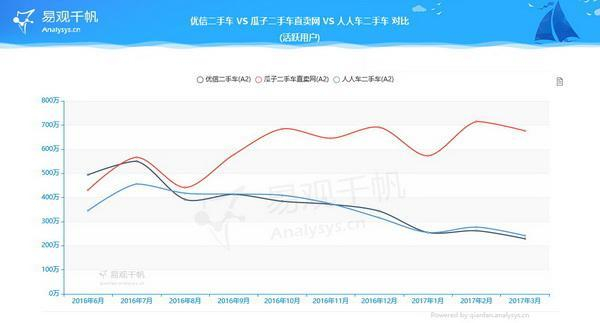 优信二手车VS瓜子二手车VS人人车二手车活跃用户对比 数据来源:易观千帆