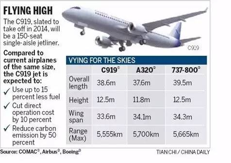 ▲ C919飞机机身长38.9米,翼展35.80米,高11.95米,主轮距7.62米,前主轮距13.47米。