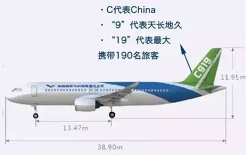 C919,全称COMAC919。其中C是China的首字母,也是中国商飞公司英文缩写COMAC的首字母,第一个“9”的寓意是天长地久,“19”代表的是中国首型中型客机最大载客量为190座。