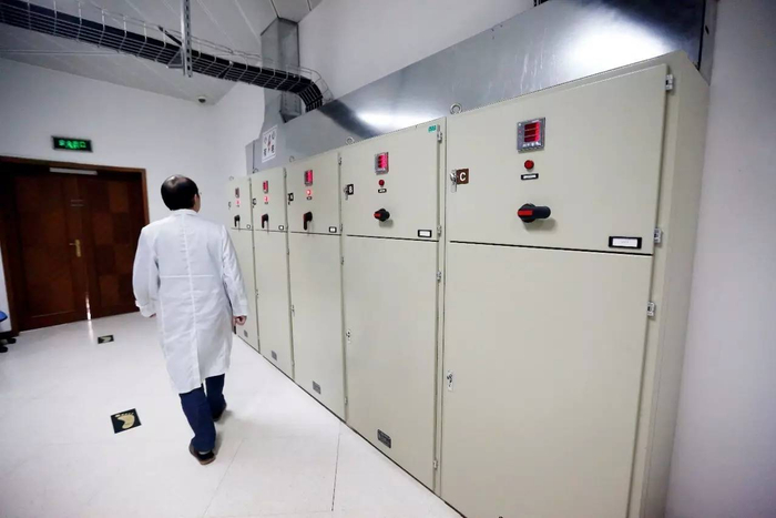 ▲ 工作人员检查配电柜是否运转正常。“魔方2”日夜不停地计算,要求24小时不断电。在所有机柜全部运转的情况下,一个月将消耗28万元的电费。但相比较“魔方”,能耗已下降至原来的三分之一至四分之一。