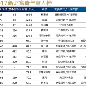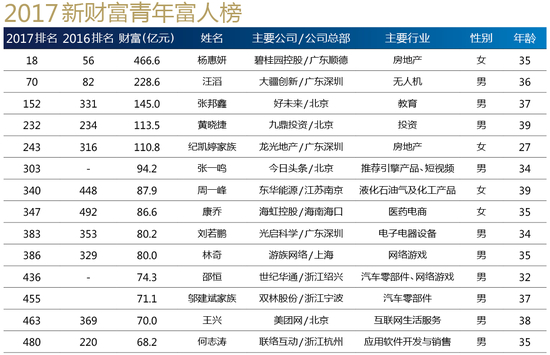 2017年,一共有14位40岁以下的年轻富豪登上新财富500富人榜。这其中,汪滔、张邦鑫、黄晓捷、张一鸣、刘若鹏、林奇、邵恒、王兴、何志涛9人都属于自主创业,其他5人的财富则来自于家族传承。其中,两名地产公司的女继承者在榜单上进取有加。由于碧桂园过去一年的良好涨幅,杨惠妍身家从2016年的276.6亿元大幅上涨至今年的466.6亿元,成为年轻一代的首富,排名更从去年的56名大幅上升至今年的18名。得益于在一线楼市的布局,代表家族持股的龙光地产纪凯婷的财富排名也同样上升至243位。