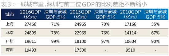 深圳近年的创业氛围及科技立城,既让华为腾讯等继续在业内保持领先优势,也因强大完备的工业基础孵化出大批如大疆创新、柔宇科技等硬科技创新类企业。从GDP来看,2016年深圳GDP与广州仅相隔118亿元,与上海相差近8000亿元。但若与2010年相比,彼时深圳GDP大约只有上海的一半,到了2016年,这一比例已升至71%(表3)。