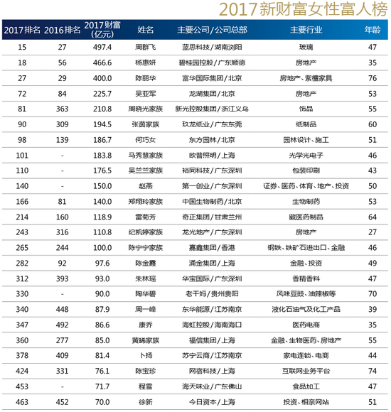 2017年新财富500富人榜,共有24位女性富豪上榜,比去年多了2位,蓝思科技周群飞超过了两位地产女富豪杨惠妍及陈丽华,以497.4亿元身家继续蝉联女性富豪榜首富,这也是她连续第三次夺取这一桂冠。