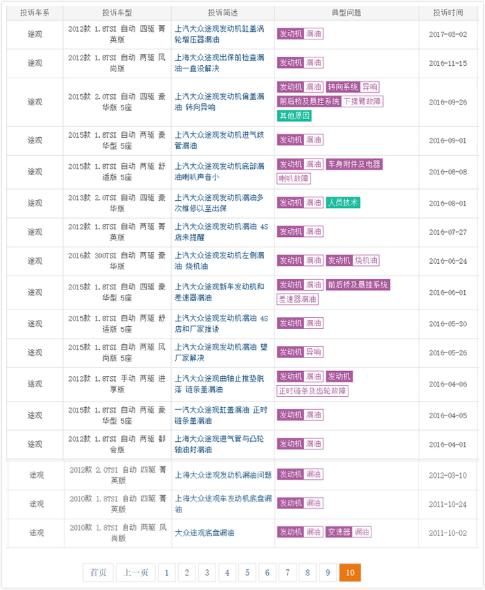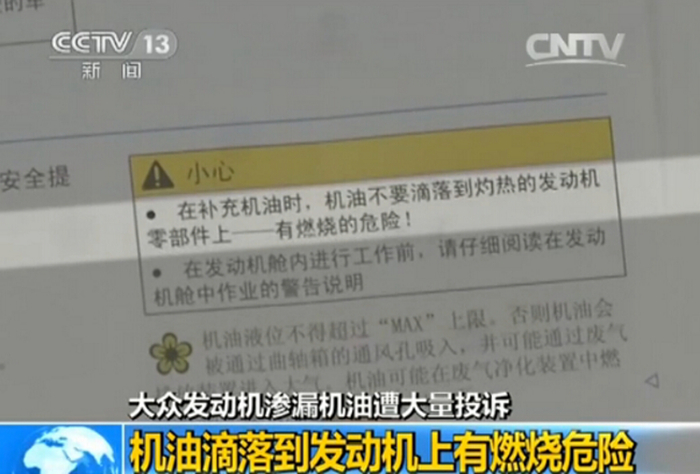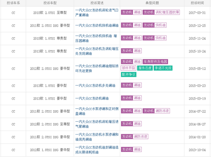大众1.8T和2.0T发动机漏油,其实已经是司空见惯的事。仅来自车质网上途观车主对途观发动机漏油的投诉就有300条,即使大众在华保有量最低的一汽-大众CC来自车主的发动机漏油投诉也有11条。途观等车发动机漏油的问题,甚至曾被央视专门报道过。