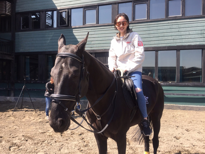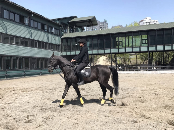 混血骑师在马场为北京时间的网友展现精彩骑术。