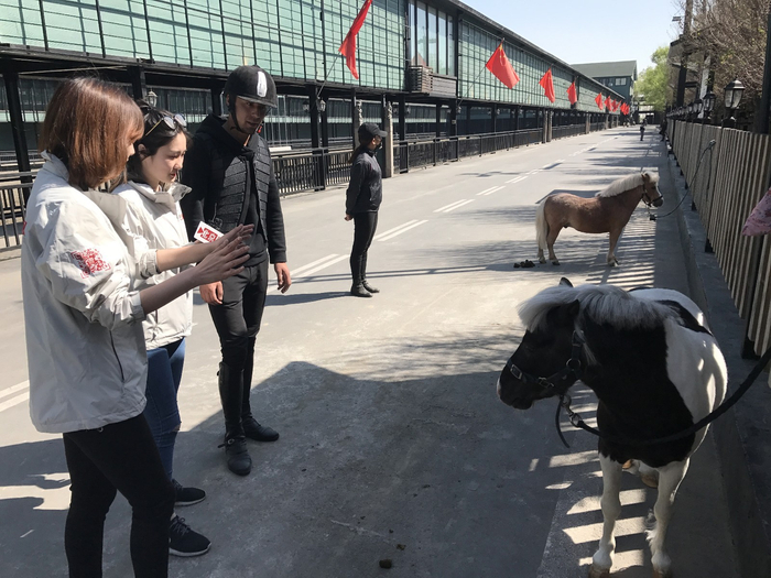 北京时间两位美女记者探访位于新疆乌鲁木齐的全国最大汗血宝马基地,图为探访可爱的迷你马。