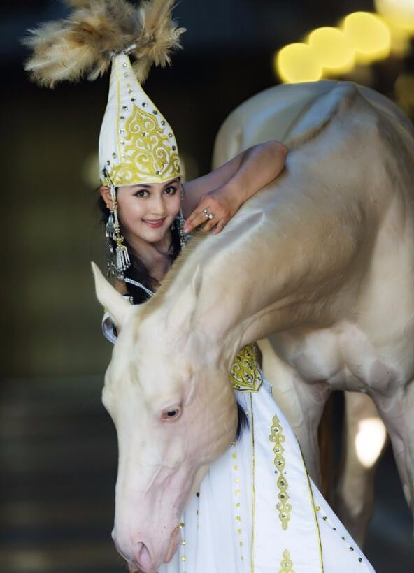 一位穿着新疆民族服饰的美女与著名汗血宝马合影。