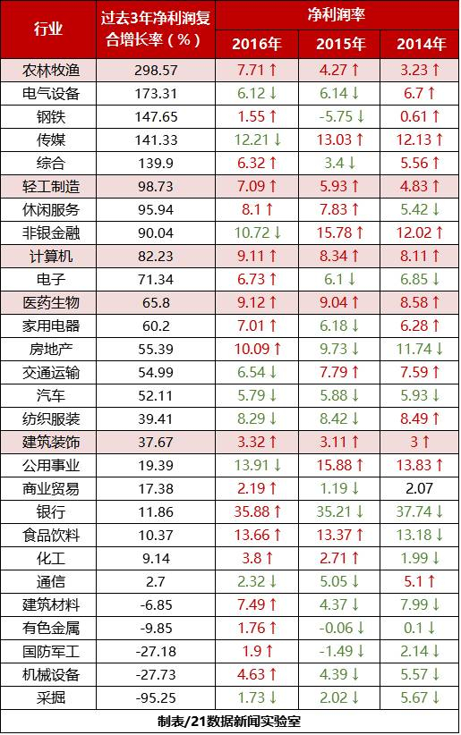 另据21数据新闻实验室统计,农林牧渔、轻工制造、计算机、医药生物、建筑装饰这5个行业在过去三年里,盈利能力逐年上升。农林牧渔净利润率更是从2014年的3.23%倍增至2016年的7.71%。