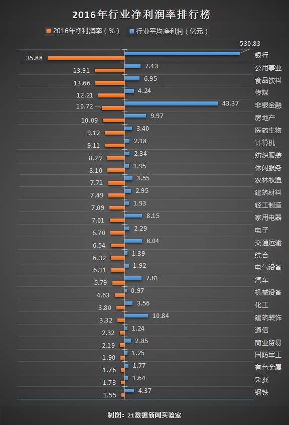 但要说哪个行业最赚钱?银行业当之无愧。无论从净利润总额、行业平均净利润还是净利润率来看,它都稳居第一。
