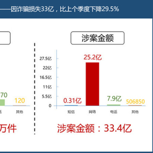 据《报告》显示,2017年第一季度用户标记诈骗号码数量相比第四季度下滑46%、诈骗电话拨打次数比第四季度降低50%、收到诈骗短信的人数也下降了31%;其中,全国因电信网络诈骗损失金额为33.4亿元,相比2016年第四季度降低了29.5%;从诈骗类型看,网络诈骗占比75%位居第一。