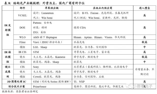 目前结构光产业链一流供应商皆已被苹果锁定,包括整体方案商PrimeSense(2013 年以 3.45 亿美元收购),核心部件 VCSEL、 DOE、WLO、 Fliter 中的一流供应商皆在与苹果做试样。目前国内厂商在 Fliter(水晶光电)、模组(欧菲光)方面具备较强实力,但在 VCSEL、 DOE、WLO、 IR CIS、 3D 图像处理芯片方面能力欠缺,以下是对结构光产业链的完全梳理。
