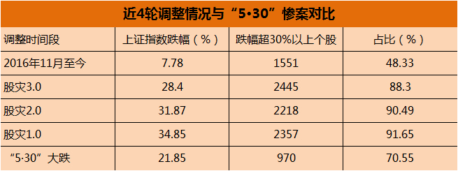 本轮调整伤情堪比2007年的"5?30"大跌,自2016年12月以来,已经有1551只股票期间超跌30%以上,占比达到48.33%。"5?30"大跌期间,有970只股票超跌30%以上,占比70.55%。