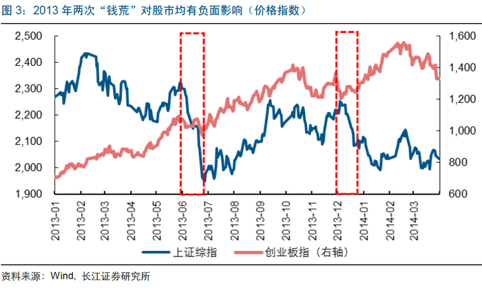 “620”和“1220”两次“钱荒”期间,上证综指与创业板指,均出现了明显的回调。同时,由于2013年6月份的“钱荒”为首次出现,其强度也显著大于2013年底的“钱荒”。