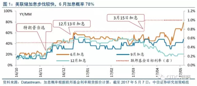 联邦基金利率期货数据显示,6月加息可能性从会前的68%提升到了78%,预计2017年全年美联储累计还将加息1~2次;而国内利率走廊的上下限水平也会随之上调。