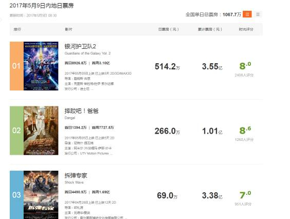 今天是《摔跤吧!爸爸》在中国上映的第五天,而根据时光网的统计,《摔跤吧!爸爸》的累计票房刚破1亿人民币,仅次于好莱坞吸睛大片《银河护卫队2》。