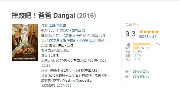 《摔跤吧!爸爸》不仅票房成绩喜人,连口碑也爆表。豆瓣上这部电影的评分已经高达9.3。多位影评人分析,它非常有望成为2017年中国内地电影市场上得分最高的电影。