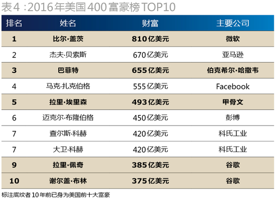 而美国的前十大富豪,和10年前的榜单竟有5位重合。比尔·盖茨连续23年蝉联第一,巴菲特微降至第三,TMT类的富豪如甲骨文的拉里·埃里森、谷歌两位创始人都还在前十名里,最主要的变化就是沃尔玛的三位股东跌出前十,而亚马逊的杰夫·贝索斯和脸书的马克·扎克伯格取而代之(表4)。