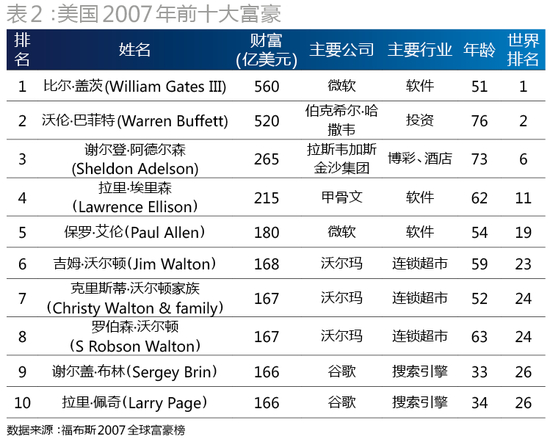 结构上的差距才是问题。2007年,当我们的前十富豪主要来自房地产时,美国的前十大富豪构成中,拥有5位TMT富豪、1位投资类富豪、3位商业服务富豪、1位酒店富豪。尤其醒目的是,跻身前十大富豪的谢尔盖·布林和拉里·佩奇(谷歌创始人)年仅33岁、34岁。美国创富的速度和能量级可见一斑。