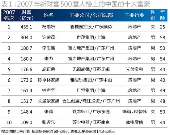 另一大变化,则是造富主要推手已由海外资本市场转至内地,2007年前十大富豪里的7位房地产富豪,清一色在香港地区或新加坡上市——中国地产行业在2006年遭遇严厉调控,融资受限的过程中,大批房地产公司赴港融资,从而将内地地产富人推到了镁光灯下,张力和李思廉的富力地产、陈卓林家族的雅居乐地产2005年IPO,钟声坚家族的仁恒置地以及许荣茂家族的世贸房地产2006年IPO,新首富杨惠妍则是2007年在港IPO。这其中,只有许荣茂家族同时在内地拥有上市公司。
