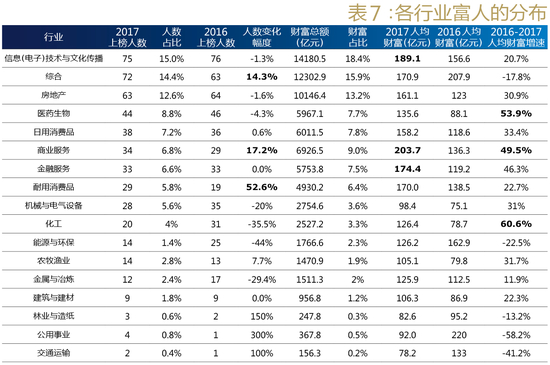 而在原本富豪人数较多的行业里,上榜富人数量涨幅前三位的是耐用消费品、商业服务及综合类富人,它们分别上涨了52.6%、17.2%、14.3%。