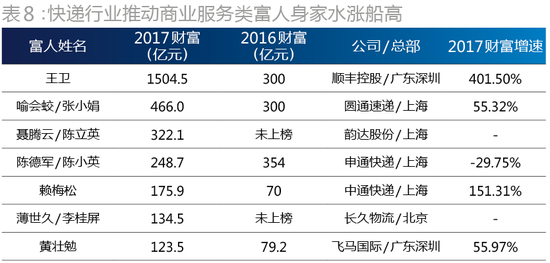 商业服务业中,快递企业在2016齐齐或借壳或上市,顺丰王卫财富暴涨4倍,成为榜单探花;而“桐庐帮”也继去年的凌厉涨势之后再次集体上涨,圆通速递喻会蛟夫妇、韵达股份聂腾云夫妇、申通快递陈德军兄妹今年的身家均已超过200亿元,在美股上市的中通快递赖海松,身家也同比暴涨了151%,达到了176亿元(表8)。
