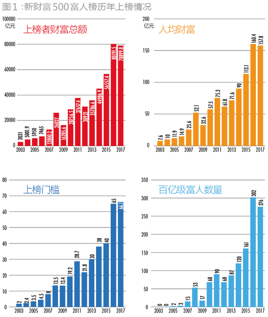 硬币的另一面,则是500富人榜上高替换率的特征:对于一个特定的富人,想能长久停留在榜单之上,并非易事。例如,十年前500富人榜上的富人,至今只有93位还在今天的榜单上。又例如,在财富门槛只略微高于去年的情况下,今年富人榜上的新面孔多达122人(等同于去年上榜者中有122人跌出榜单),高于2016年的118人更换率,更远高于2015年的82人。