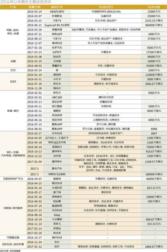 “放权”后的马化腾,在2016年依旧是用投资来补足腾讯的短板。在泛娱乐板块,首先是在推动腾讯文学与盛大文学合并后,筹备阅文集团的上市。2016年5月,腾讯联合微影时代以8500万美元投资韩国YG娱乐,成为其第四大股东。2016年7月,腾讯旗下的QQ音乐则与中国音乐集团(原海洋音乐集团,酷狗、酷我音乐控股方)合并,成立了腾讯音乐集团。此外,2016年最火的直播腾讯也有涉足,分别在3月和8月参与了斗鱼TV的两轮融资。而于近期关闭微视的腾讯,又在2017年3月以1.75亿美元投资了快手,借此弥补短视频的短板。