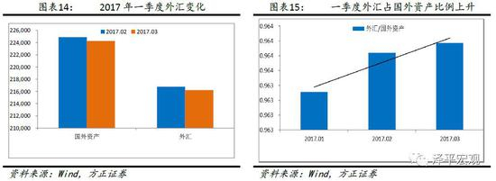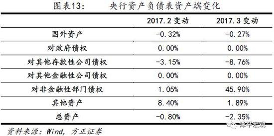 从央行的资产端来看,2017年一季度资产负债表主要变动原因是央行对其他存款性公司债权的大幅度下降,国外资产的变动是部分原因。