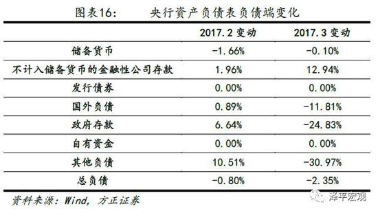 从央行的负债端来看,储备货币和政府存款的变动是导致负债收缩的主要因素。在资金收窄背景下,MPA考核升级,流动性受到影响,2017年2月份储备货币大幅度下跌,超过1.6%。除此之外,政府存款也大幅减少。