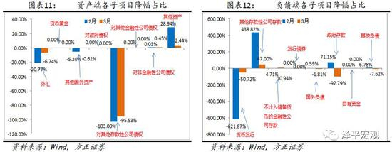 2017年第一季度央行总资产从1月的34.83万亿收缩到3月的33.74万亿,第一季度约下降1.1万亿。引起了市场较大关注。我们将各子项目下降额占总资产(总负债)下降额的比重计算出来,如图表11、图表12所示。
