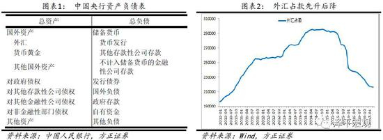 中国央行资产负债表如图表1所示。资产端,“外汇”以及“对其他存款性公司债权”占据总资产超过85%的比重;负债端,“储存货币”占据总负债超过85%的比重。当央行缩表出现时,一般上述三个子项目缩水最为明显。