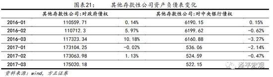 2017年一季度央行缩表对货币供应造成的影响较大。政府存款下降0.6万亿,基础货币下降超过0.5万亿。货币发行总量下降2.1万亿,其他存款性公司存款增加1.6万亿。此次缩表也主要是收紧对商业银行的资金融出。