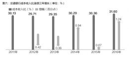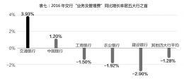 同时,这已是交行成本收入比连续第三年增长。2014~2016年,该指标依次为30.29%、30.36%和31.6%,分别增长0.94个百分点、0.07个百分点和1.24个百分点(见表六)。
