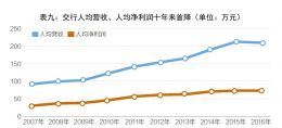 数据显示,交行2016年的人均营业收入、人均净利润均出现了十年来的首次降低。其中,交行去年人均营业收入为208.66万元,同比下降了1.53%;人均净利润为72.62万元,同比下降了0.15%(见表九)。