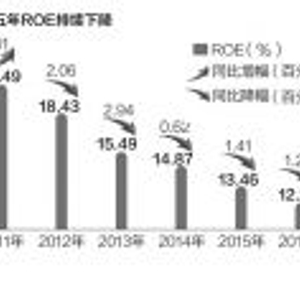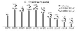 通过对比,记者发现,交行2016年的净资产收益率(ROE)为12.22%,同比下降了1.24个百分点。然而,这并不是交行净资产收益率的首次下 降。此前连续五年,交行的净资产收益率都出现了不同程度的下降。数据显示,交行2012~2016年的净资产收益率分别为18.43%、15.49%、 14.87%、13.46%和12.22%,分别下降2.06个百分点、2.94个百分点、0.62个百分点、1.41个百分点和1.24个百分点(见表 一)。
