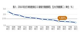 2016年,交行净息差为1.88%,低于13家全国性银行的平均值,排名五大行倒数第二,13家银行倒数第四(见表八)。同时,交行的净利差排名五大行倒数第一,13家银行排名倒数第三,仅为1.75%。