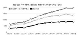 具体看,交行2016年营业收入、营业利润分别为1931.29亿元和853.5亿元,同比降幅分别为0.36%和0.42%,为十年来的首次下降。2007~2015年,交行的营业收入、营业利润均保持了较高幅度的增长,但增长趋势整体在减弱。