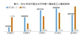 数据显示,2016年交行的员工总数达92556人,比2015年同期增加了1088人,增幅达1.19%。而此前两年,该行都在减少员工数量。2014年、2015年,交通银行员工总数分别为93658和91468人,同比分别下降6.27%和2.34%。